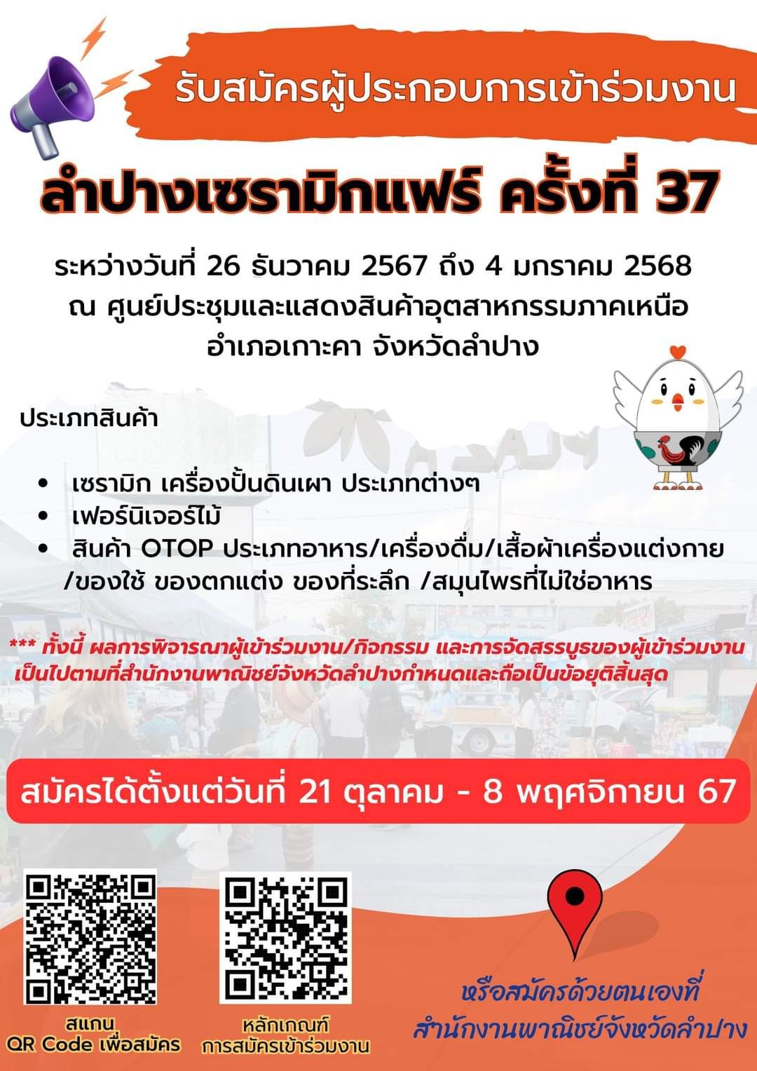 รับสมัครผู้ประกอบการจังหวัดลำปาง เข้าร่วมจำหน่ายสินค้าในงาน ”ลำปางเซรามิกแฟร์ครั้งที่ 37” ระหว่างวันที่ 26 ธันวาคม 2567 - วันที่ 4 มกราคม 2568 ณ ศูนย์ประชุมและแสดงสินค้าอุตสาหกรรมภาคเหนือ ตำบลศาลา อำเภอเกาะคา จังหวัดลำปาง