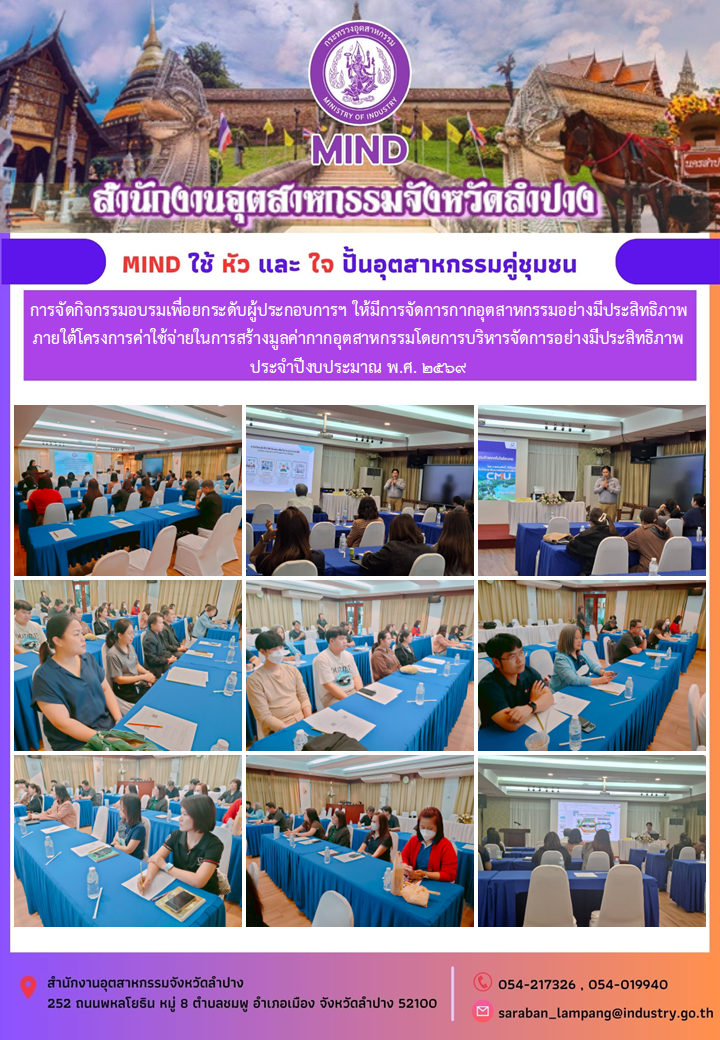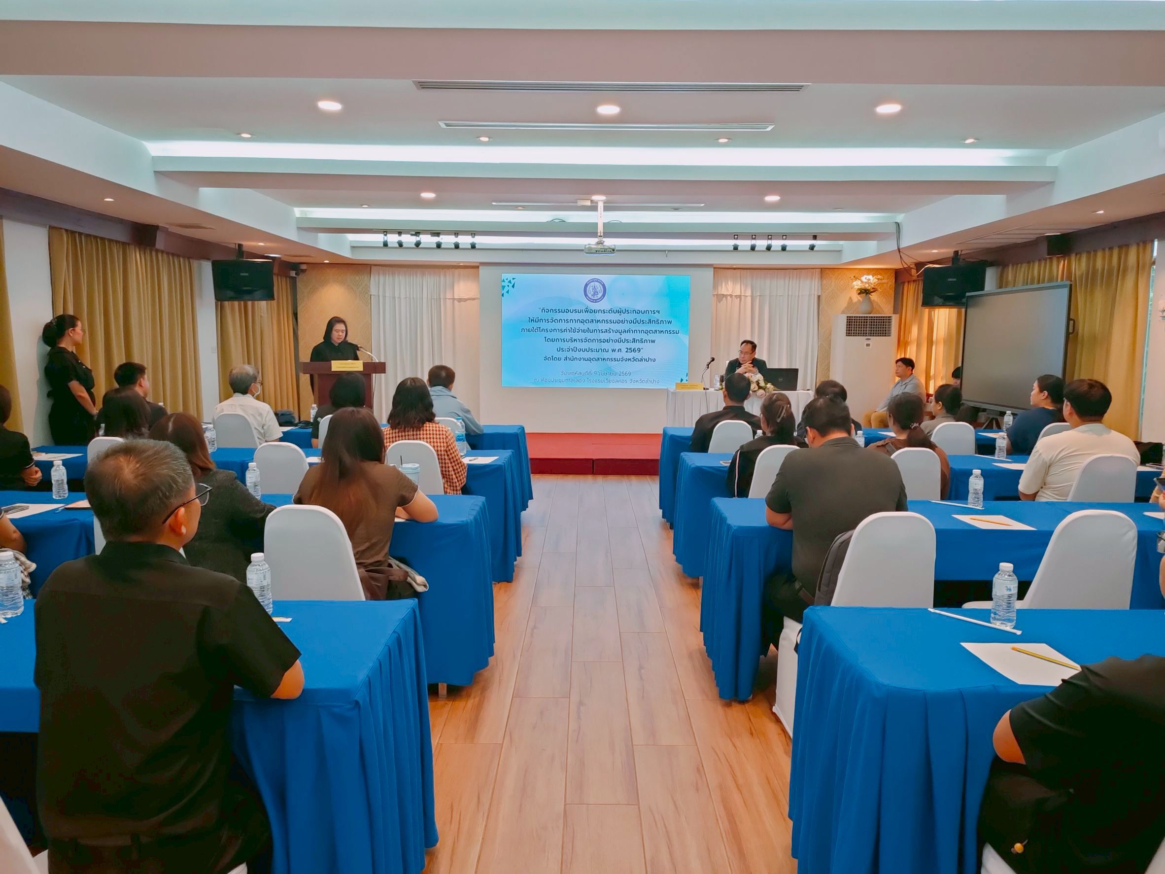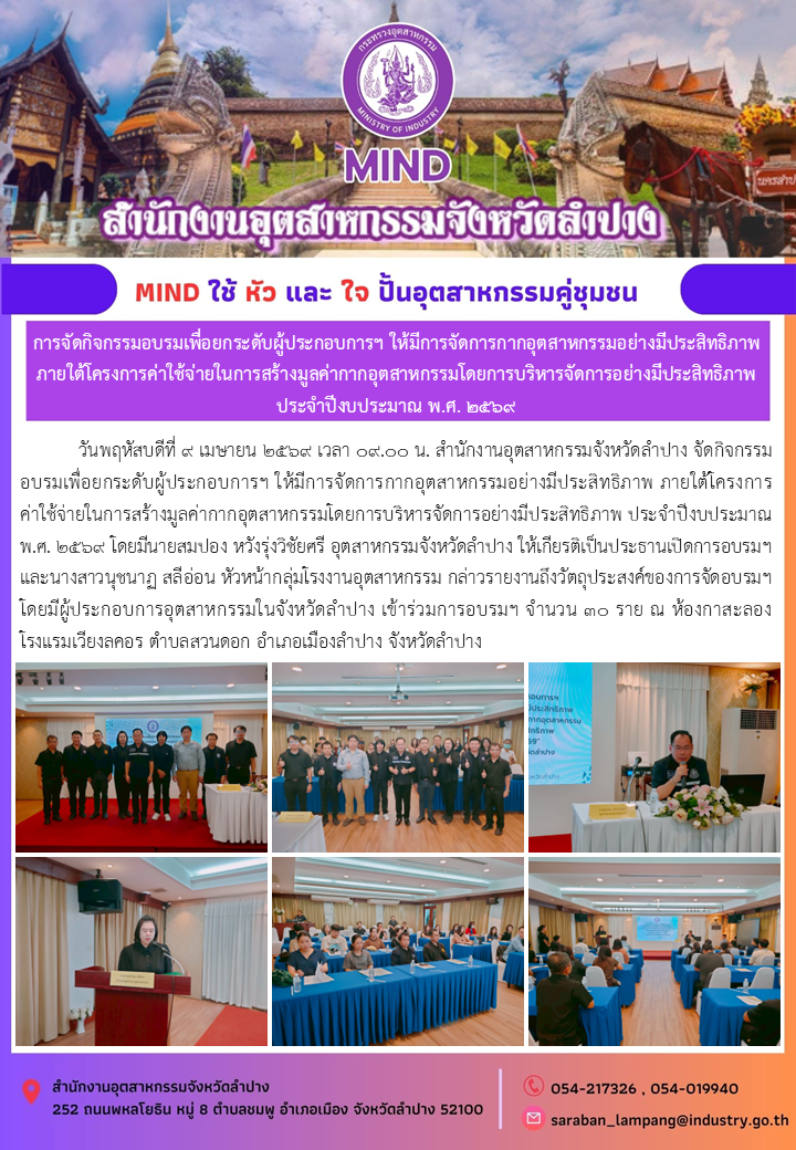 วันพฤหัสบดีที่ ๙ เมษายน ๒๕๖๙ เวลา ๐๙.๐๐ น. สำนักงานอุตสาหกรรมจังหวัดลำปาง จัดกิจกรรมอบรมเพื่อยกระดับผู้ประกอบการฯ ให้มีการจัดการกากอุตสาหกรรมอย่างมีประสิทธิภาพ ภายใต้โครงการค่าใช้จ่ายในการสร้างมูลค่ากากอุตสาหกรรมโดยการบริหารจัดการอย่างมีประสิทธิภาพ ประจำปีงบประมาณ พ.ศ. ๒๕๖๙ โดยมีนายสมปอง หวังรุ่งวิชัยศรี อุตสาหกรรมจังหวัดลำปาง ให้เกียรติเป็นประธานเปิดการอบรมฯ และนางสาวนุชนาฏ สลีอ่อน หัวหน้ากลุ่มโรงงานอุตสาหกรรม กล่าวรายงานถึงวัตถุประสงค์ของการจัดอบรมฯ โดยมีผู้ประกอบการอุตสาหกรรมในจังหวัดลำปาง เข้าร่วมการอบรมฯ จำนวน ๓๐ ราย ณ ห้องกาสะลอง โรงแรมเวียงลคอร ตำบลสวนดอก อำเภอเมืองลำปาง จังหวัดลำปาง